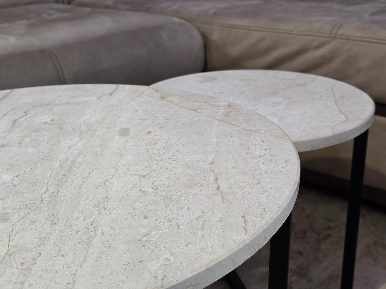 Съчетавайки естествен каменен плот в светъл, неутрален нюанс и стабилна метална основа в черно, масите са перфектното допълнение към всяко пространство.